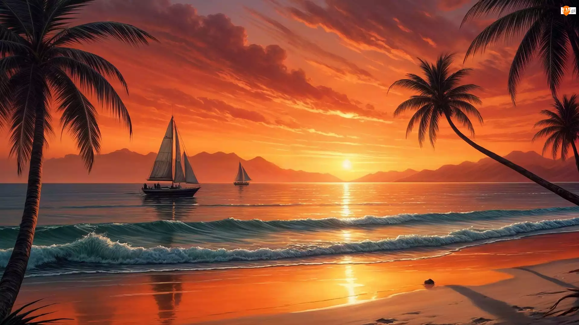Plaża, Morze, Zachód Słońca, Grafika, Palmy, Żaglówki