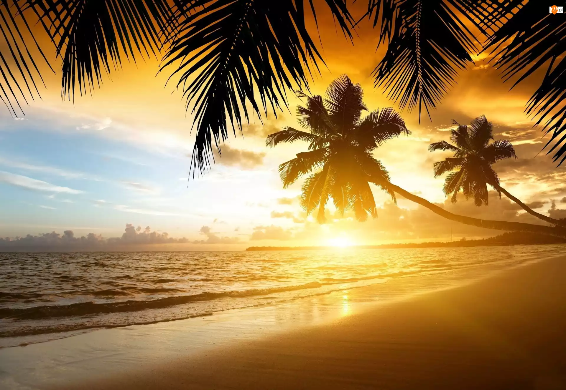 Palmy, Zachód, Morze, Słońca, Plaża