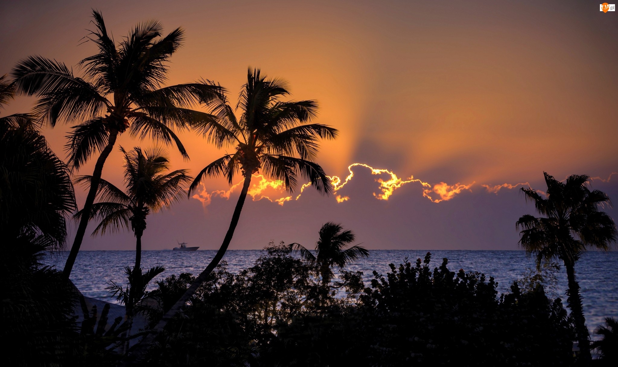 Palmy, Zachód, Morze, Słońca, Statek, Chmury