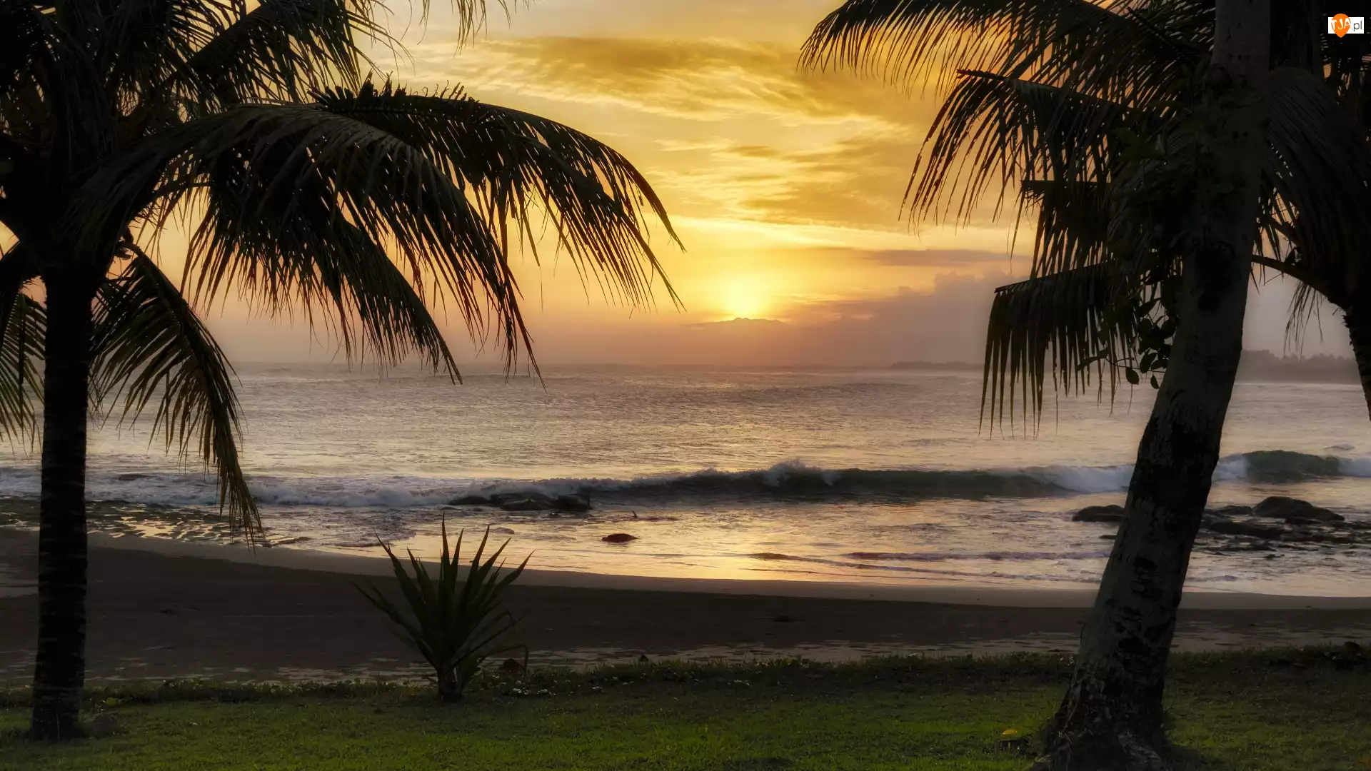 Palmy, Zachód słońca, Morze, Fala