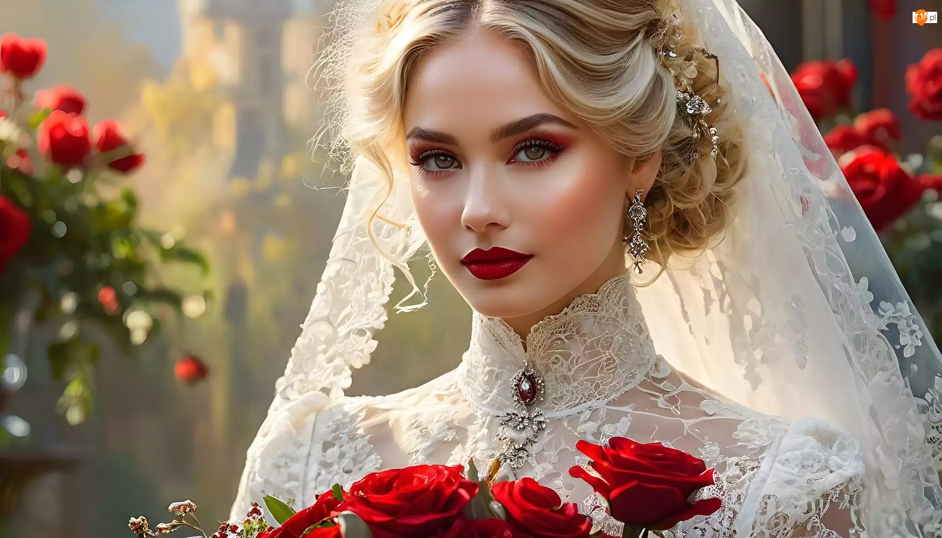 Panna młoda z bukietem róż