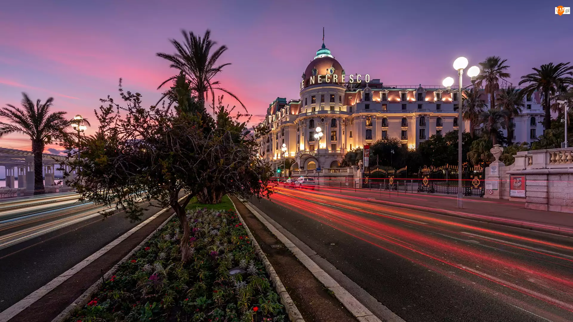 Nicea, Noc, Hotel Negresco, Francja, Domy, Drzewa, Ulica