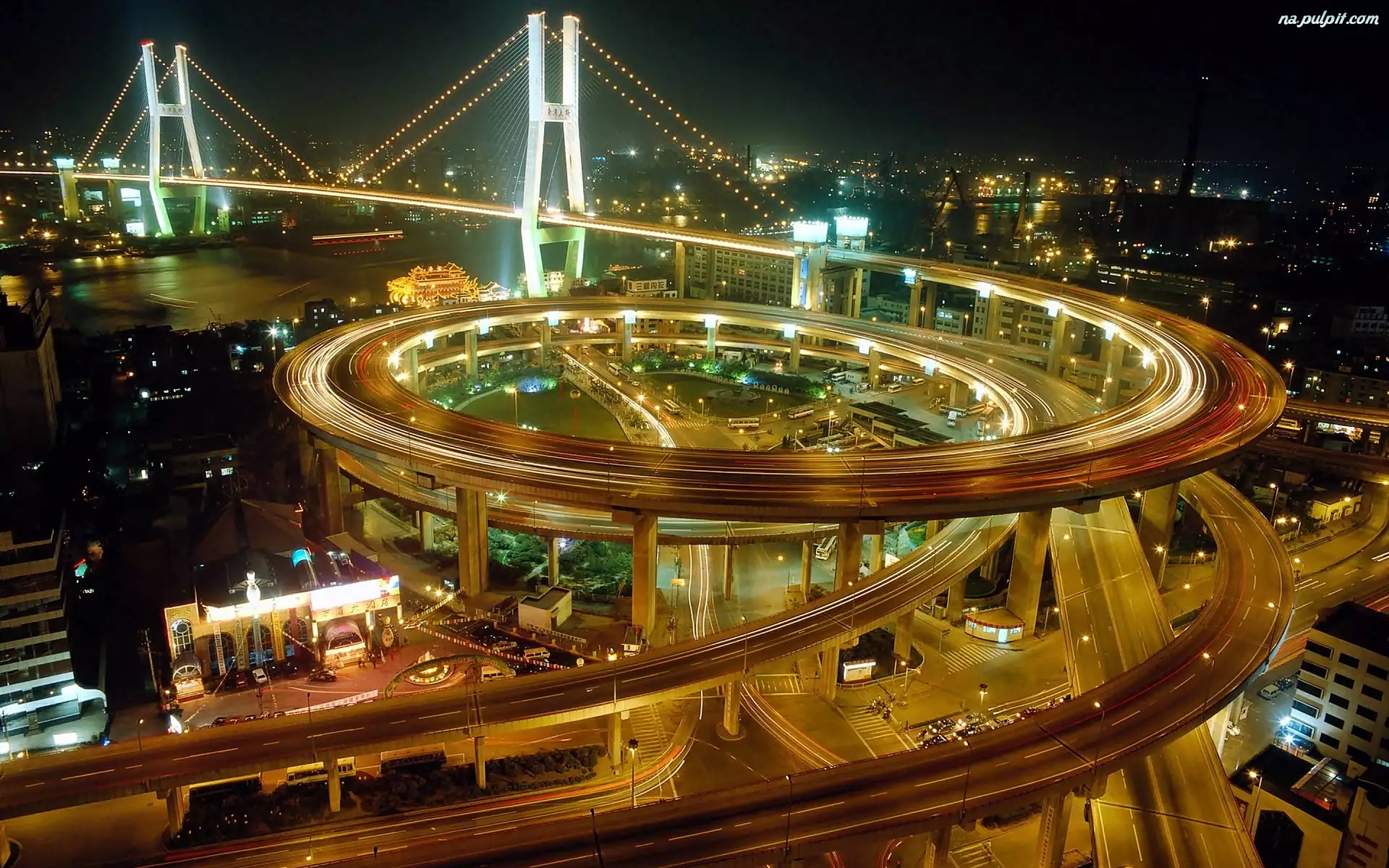 Panorama, Nocą, Estakada, Most, Szanghaju