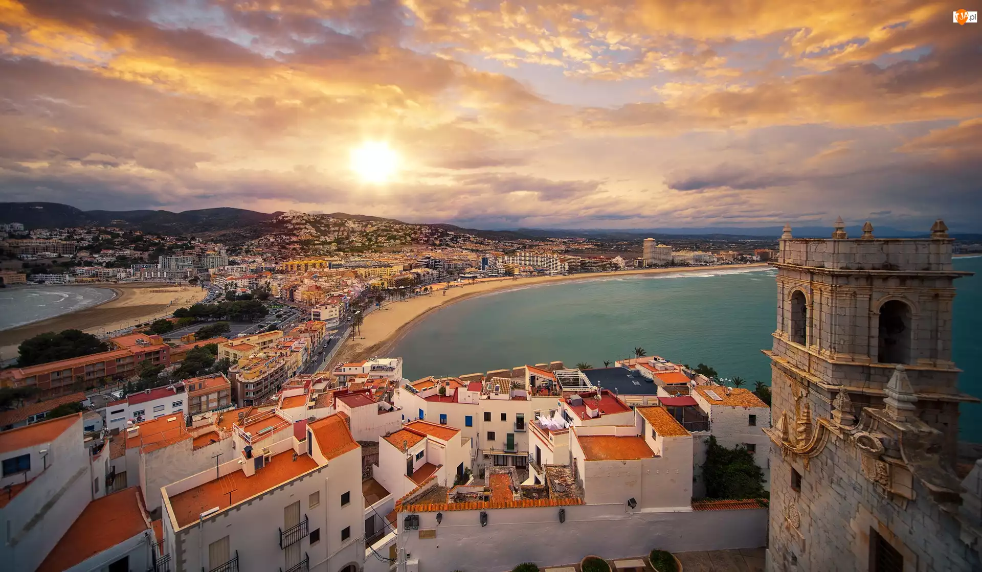 Walencja, Miejscowość Peniscola, Wschód słońca, Hiszpania, Chmury, Morze, Domy