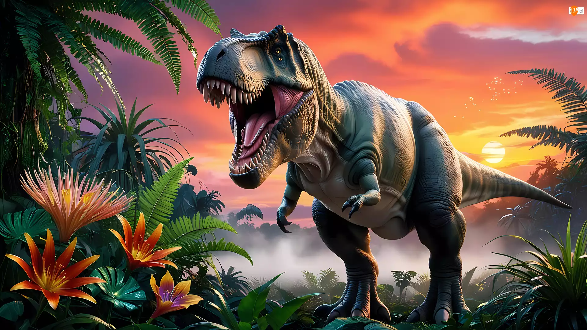 Paprocie, Dinozaur, Zachód słońca, Kwiaty