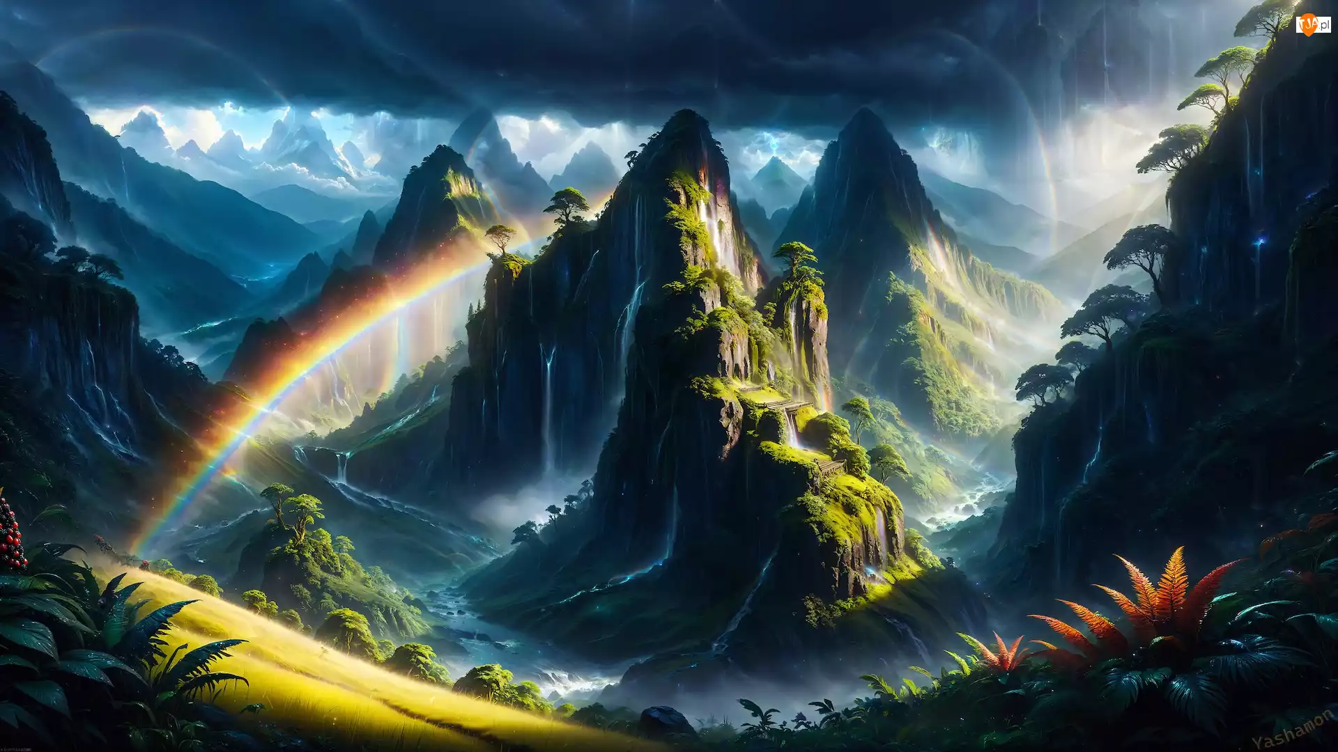 Paprocie, Grafika, Tęcza, Chmury, Góry, Skały, Deszcz Fantasy, Przebijające światło
