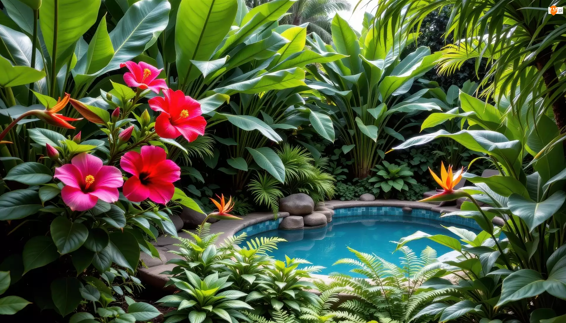 Paprocie, Ogród, Czerwone, Liście, Oczko wodne, Strelicje, AI, Kwiaty