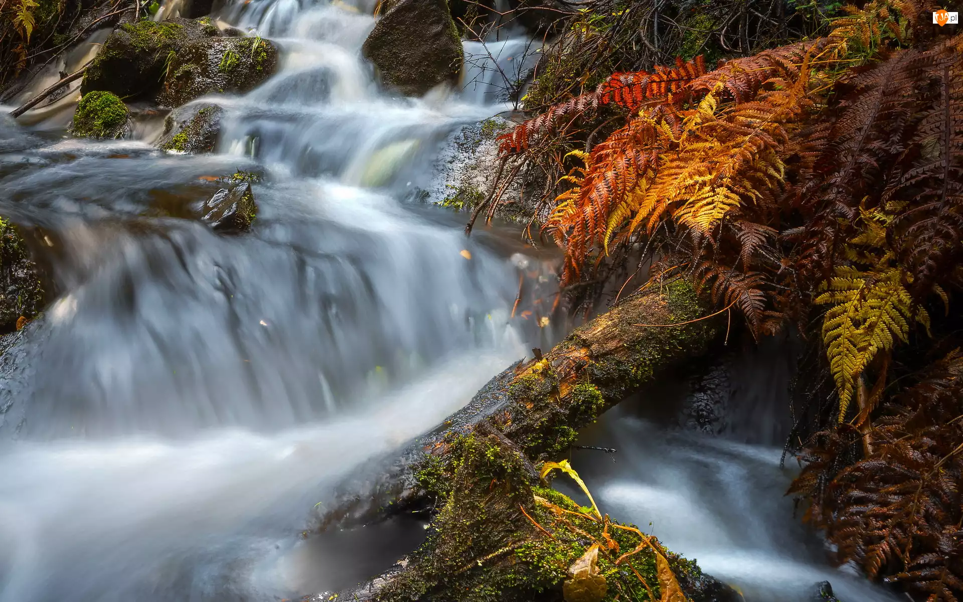 Paprocie, Rzeka, Drzewa, Las, Pień, Kamienie