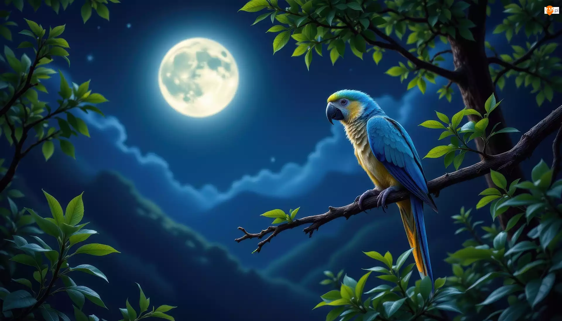 Papuga i liście na gałęzi w blasku księżyca w