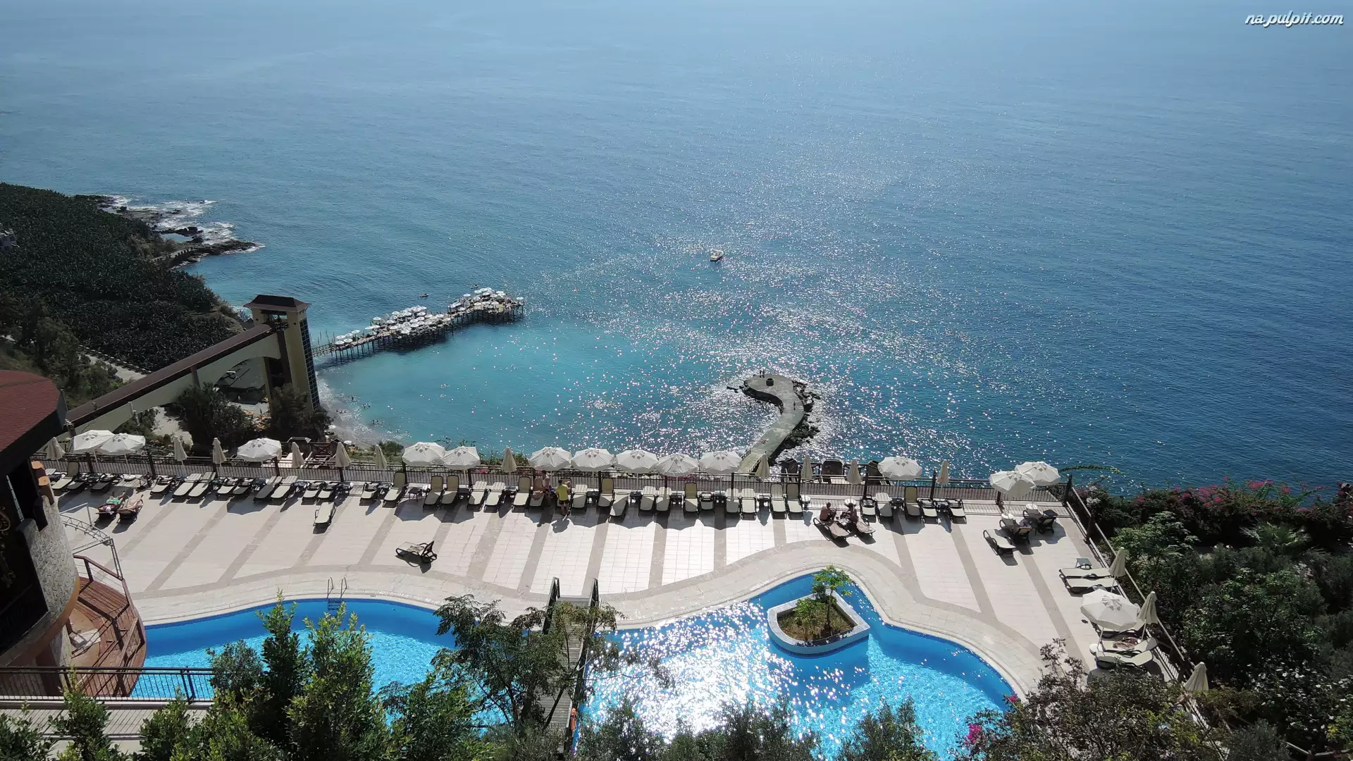 Parasole, Turcja, Basen, Drzewa, Alanya, Leżaki, Morze, Taras