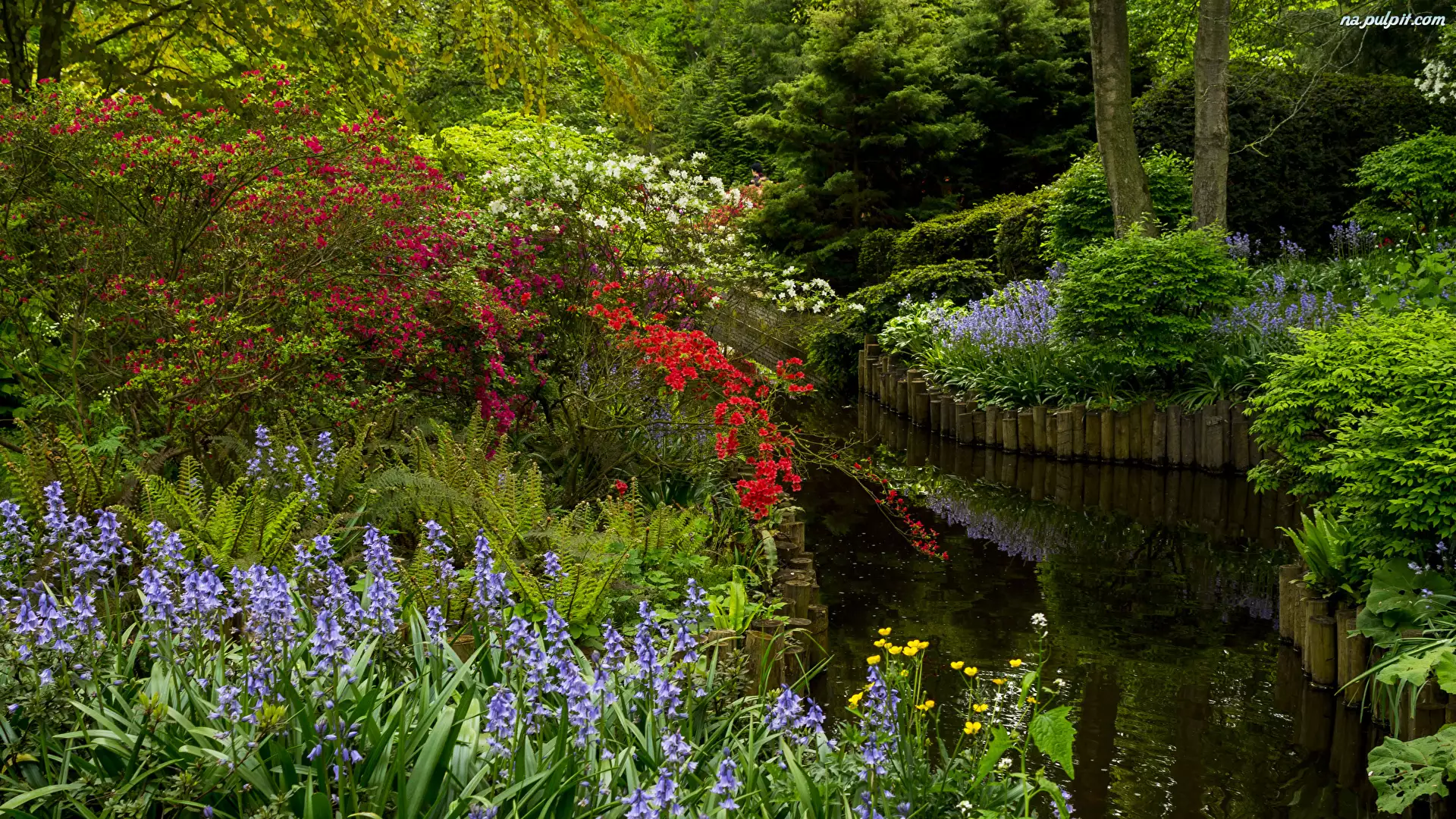 Holandia, Staw, Drzewa, Dzwonki, Park, Ogród Keukenhof, Różaneczniki, Krzewy, Kwiaty, Lisse