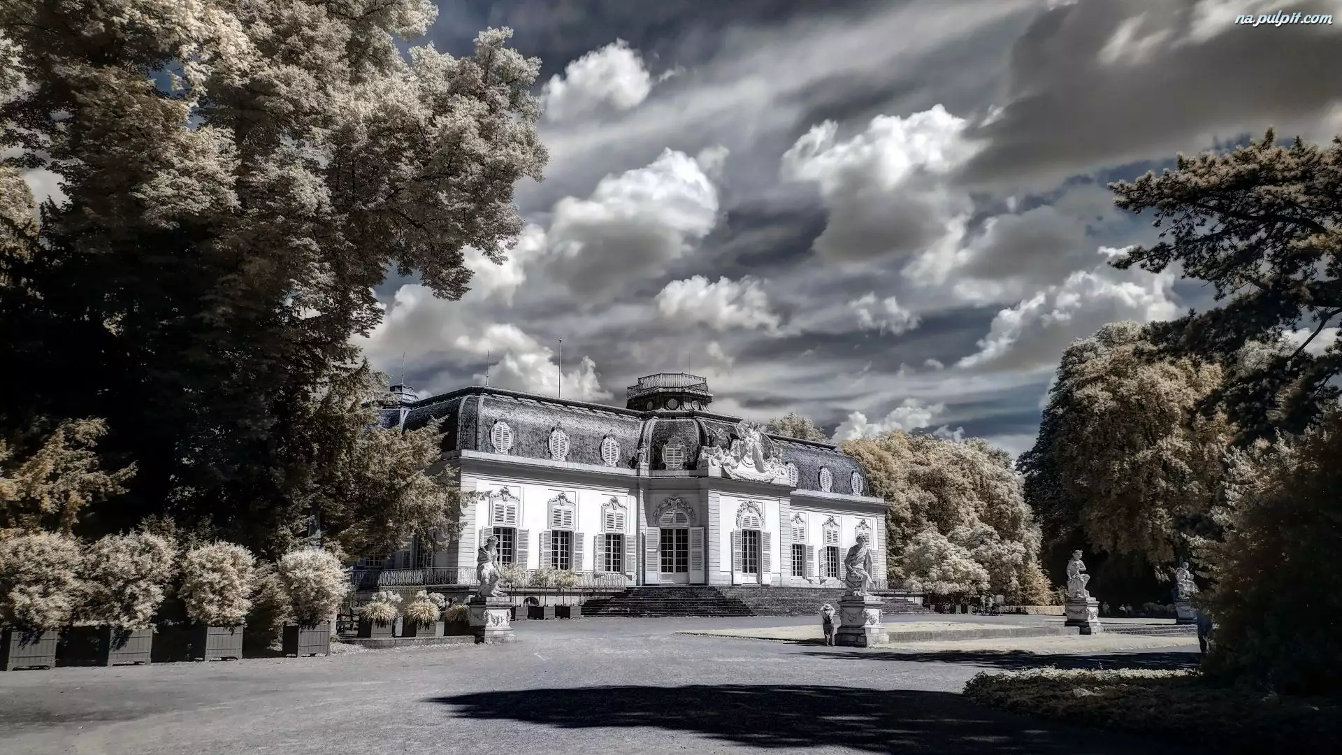 Park, Czarno-Białe, Zamek, Sepia, Posągi, Drzewa