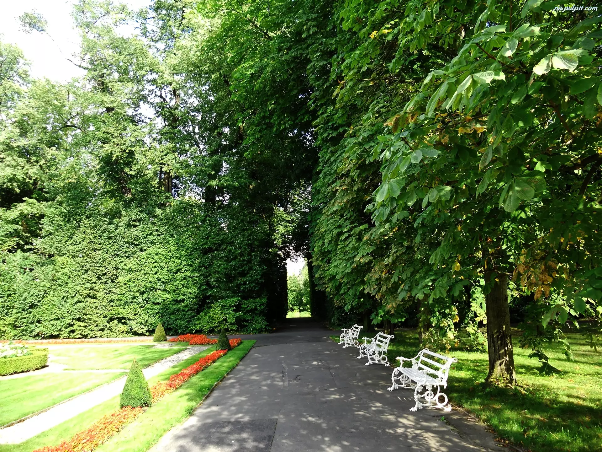 Drzewa, Park, Aleja, Ławki