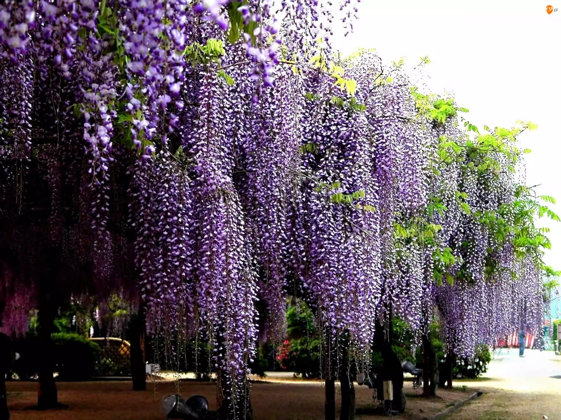 Fioletowe, Park, Glicynia, Drzewa, Kwiaty