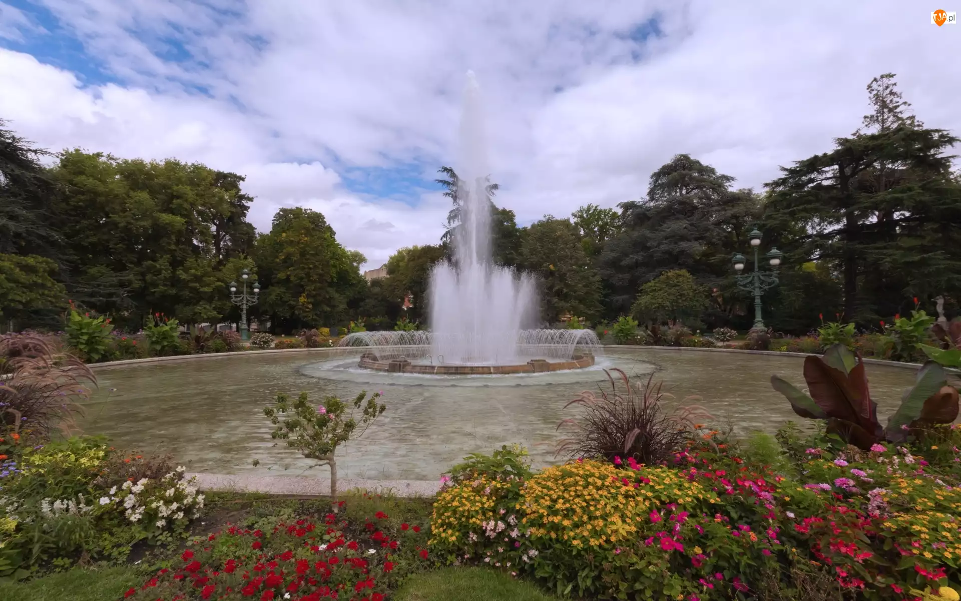 Park, Fontanna, Latarnie, Kwiaty, Staw