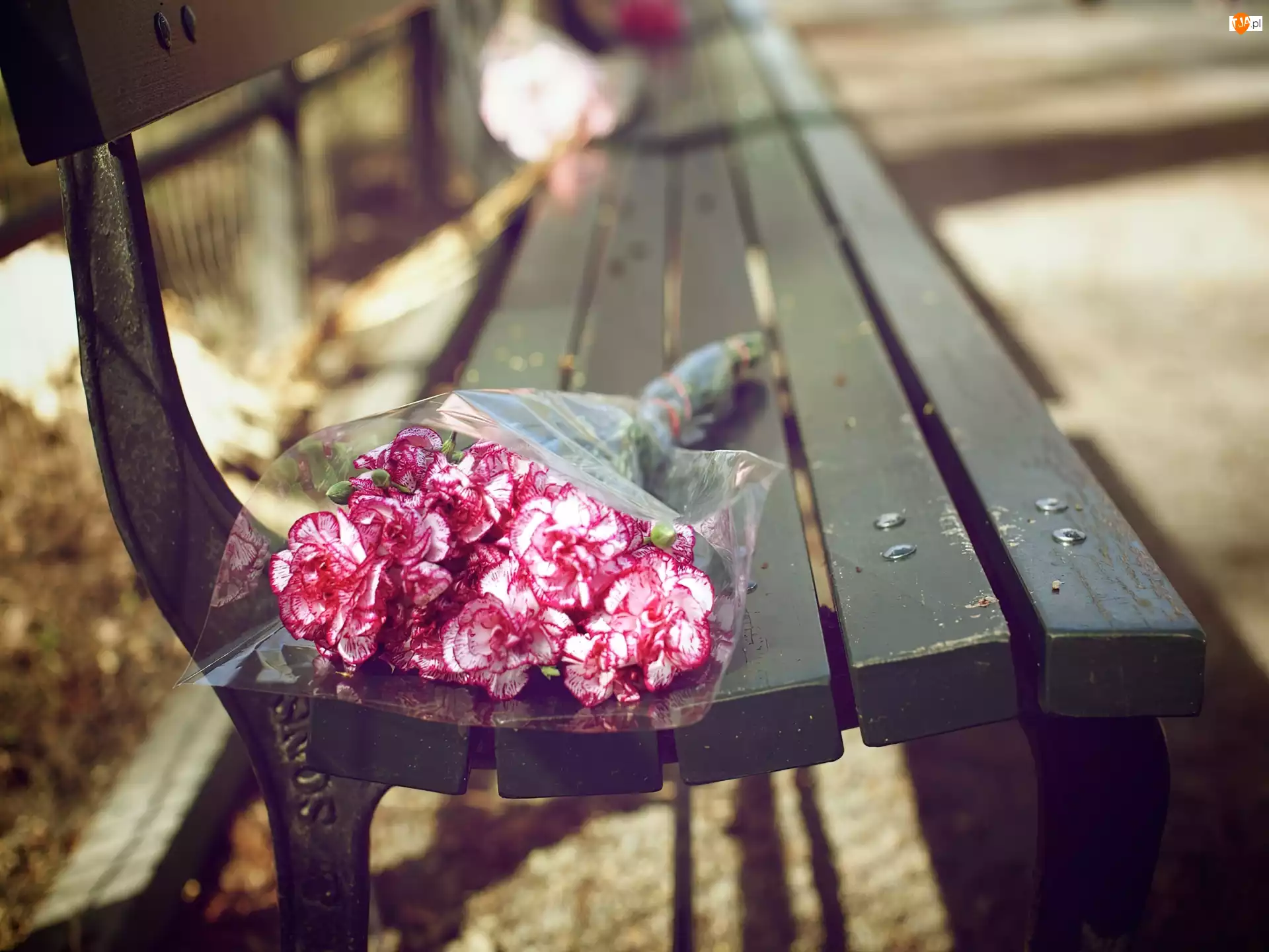 Goździki, Park, Ławka, Bukiet