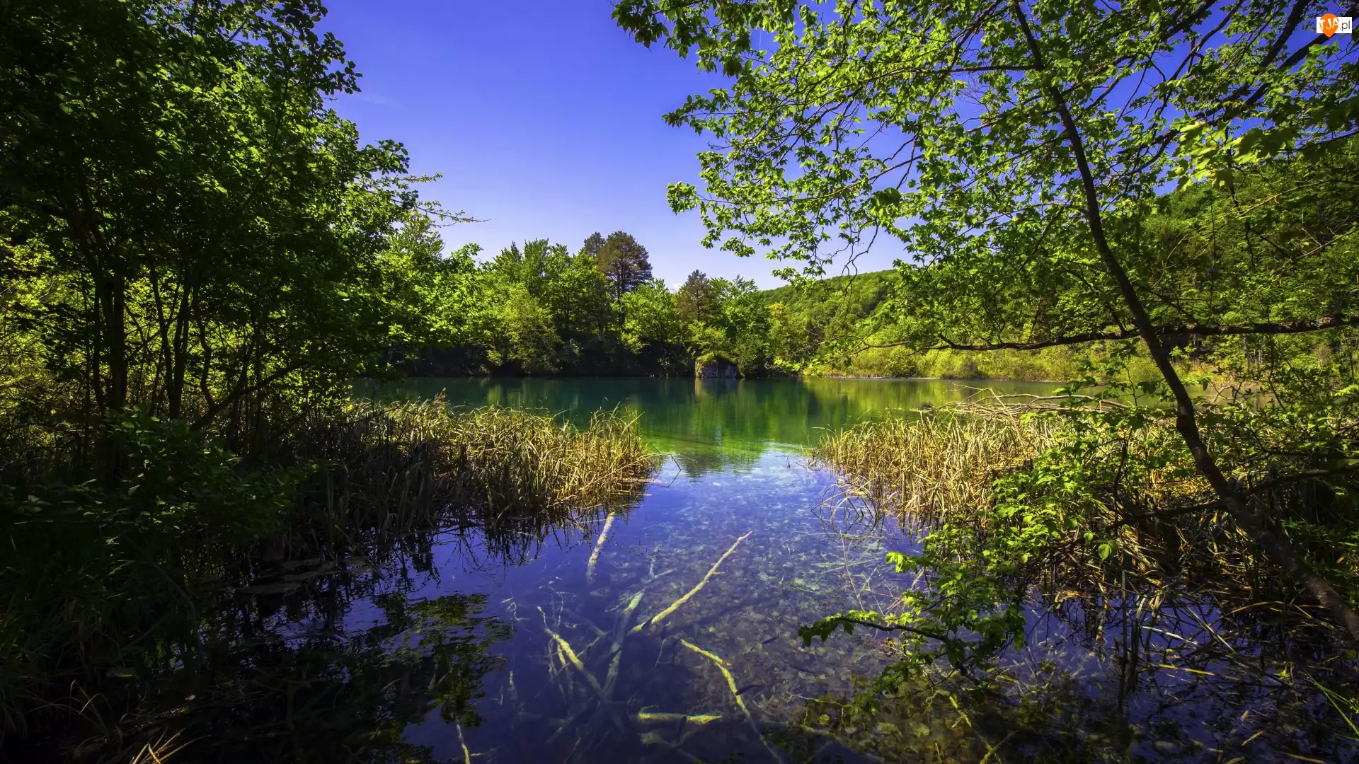 Drzewa, Chorwacja, Zieleń, Krzewy, Park Narodowy Jezior Plitwickich, Trawa, Niebo, Jezioro