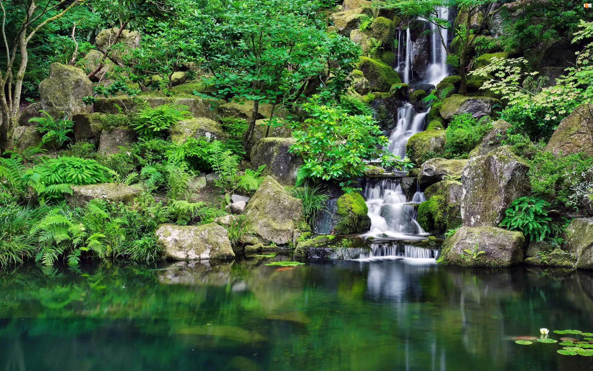 Park, Jeziorko, Wodospad, Skały