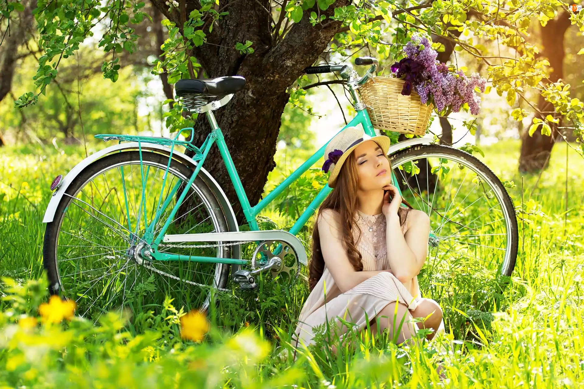 Park, Koszyk, Wiosna, W, Rower, Dziewczyna, Odpoczynek, Kapeluszu, Bez