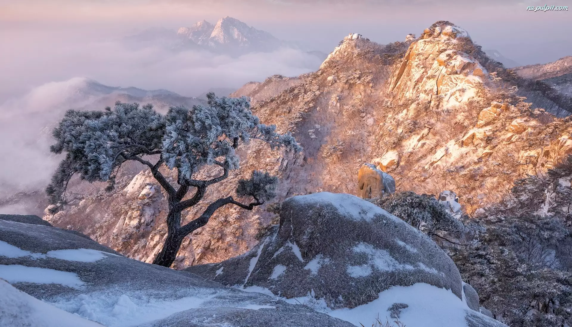 Korea Południowa, Drzewo, Sosna, Kamienie, Góry, Park Narodowy Bukhansan, Ośnieżone, Zima, Skały, Prowincja Gyeonggi-do