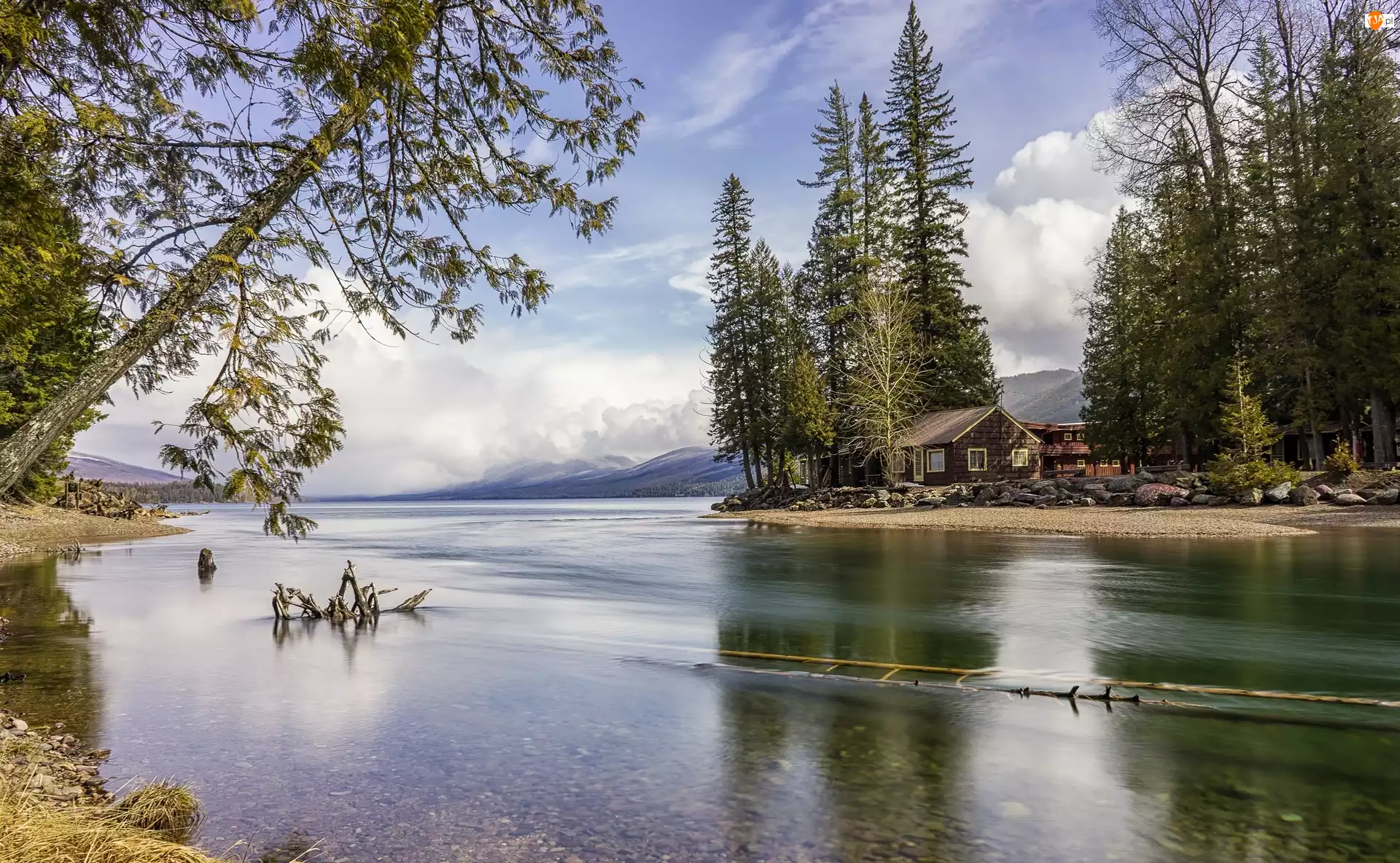 Rzeka, Park Narodowy Glacier, Dom, Stany Zjednoczone, Drzewa, Stan Montana