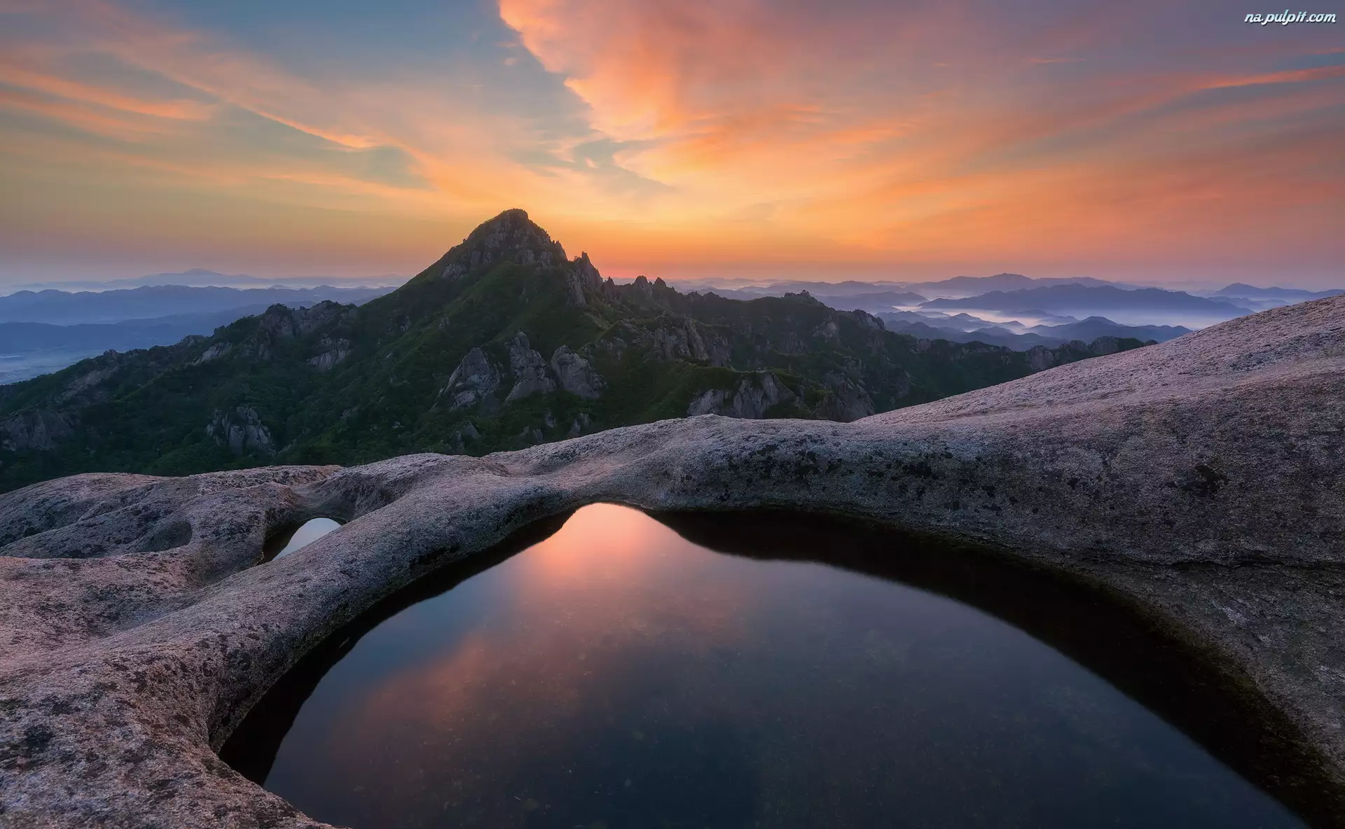 Zachód słońca, Korea Południowa, Góry, Park Narodowy Wolchulsan, Prowincja Jeolla Południowa