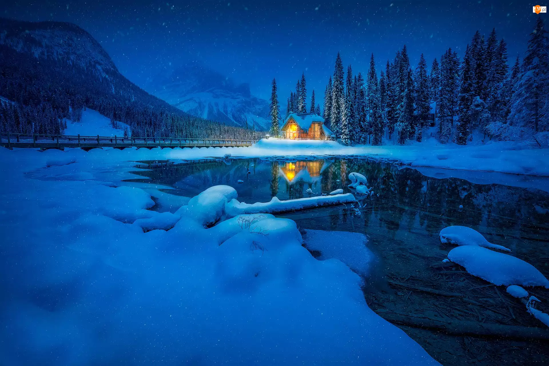 Kanada, Park Narodowy Yoho, Prowincja Kolumbia Brytyjska, Góry, Las, Jezioro Emerald Lake, Dom, Zima, Most