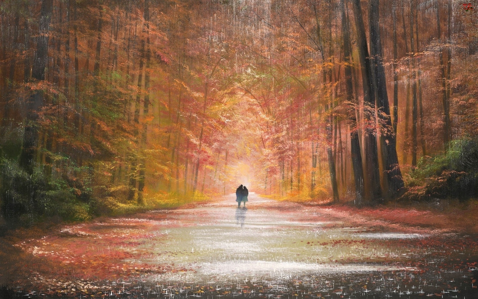 Park, Para, Obraz, Spacerowiczów, Las, Deszcz