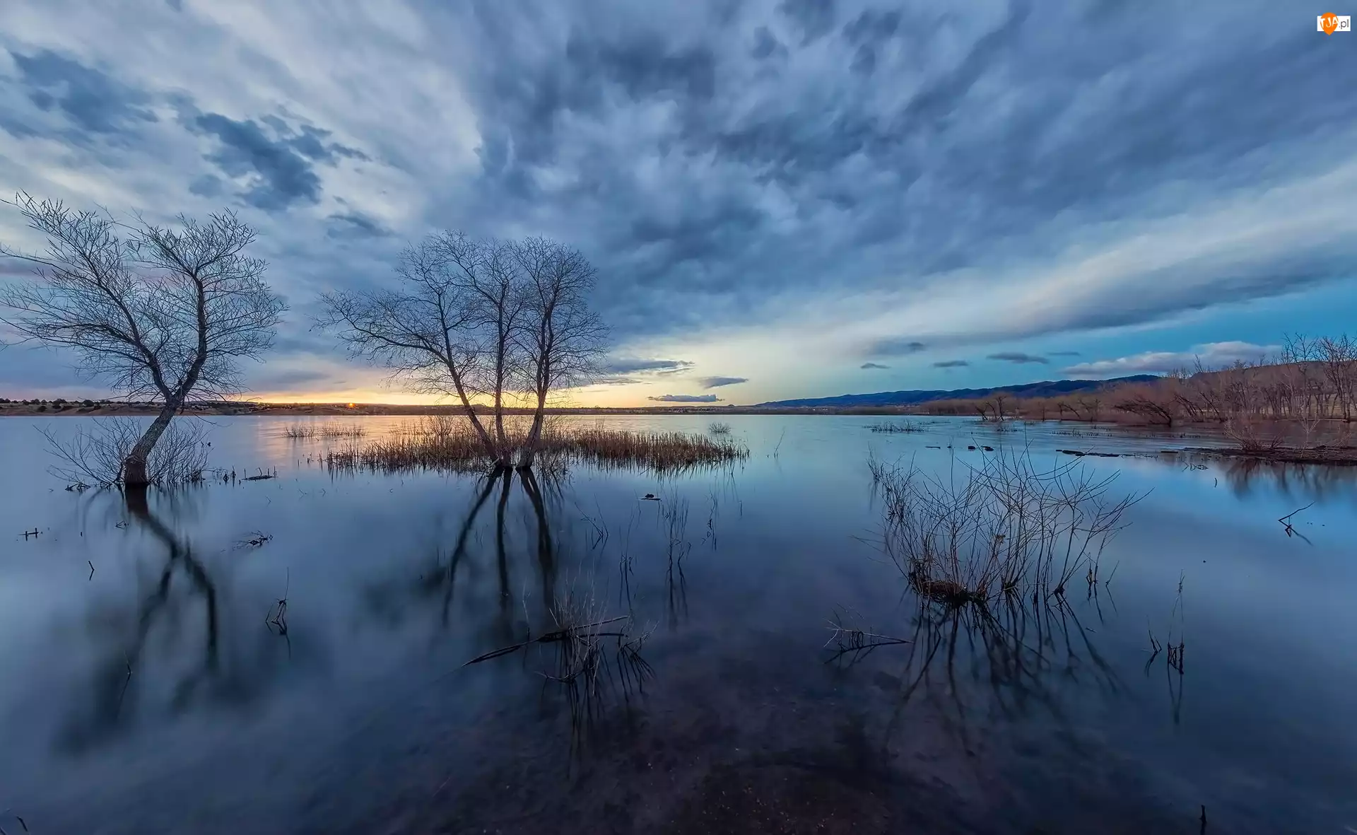Park stanowy Chatfield, Poranek, Chmury, Kolorado, Jezioro, Drzewa, Stany Zjednoczone, Lake Chatfield