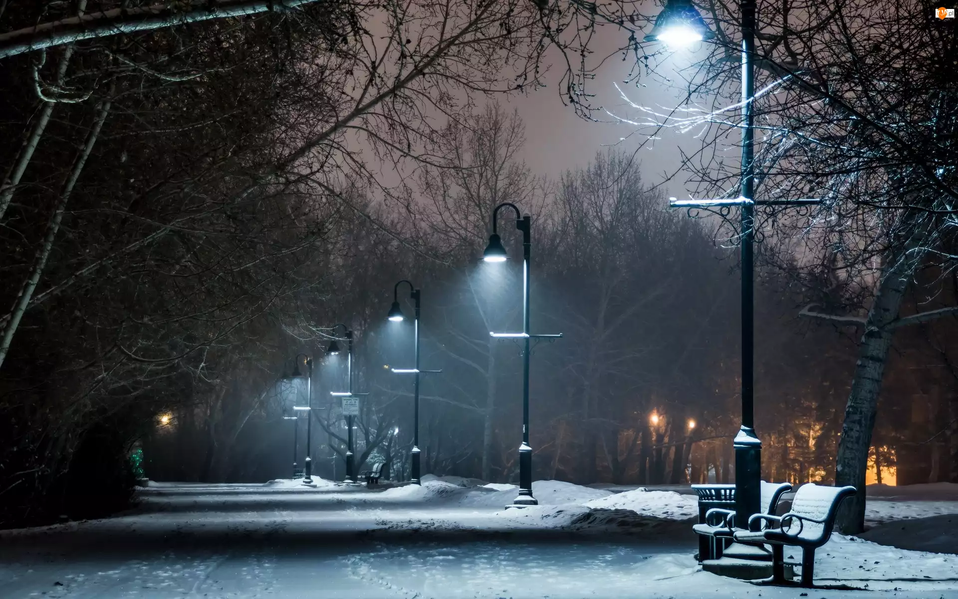 Zima, Park, Latarnie, Ławki