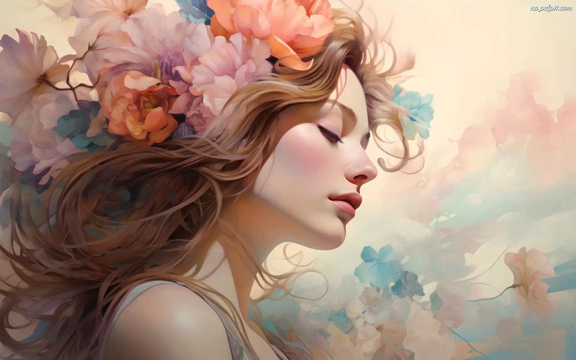 Pastelowe, Grafika, Kwiaty, Dziewczyna, Kolory