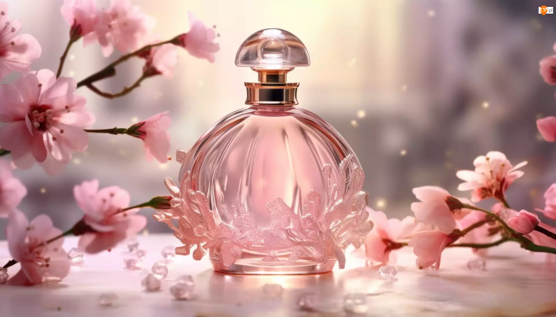 Perfumy, Flakon, Różowe, Kompozycja, Gałązki,