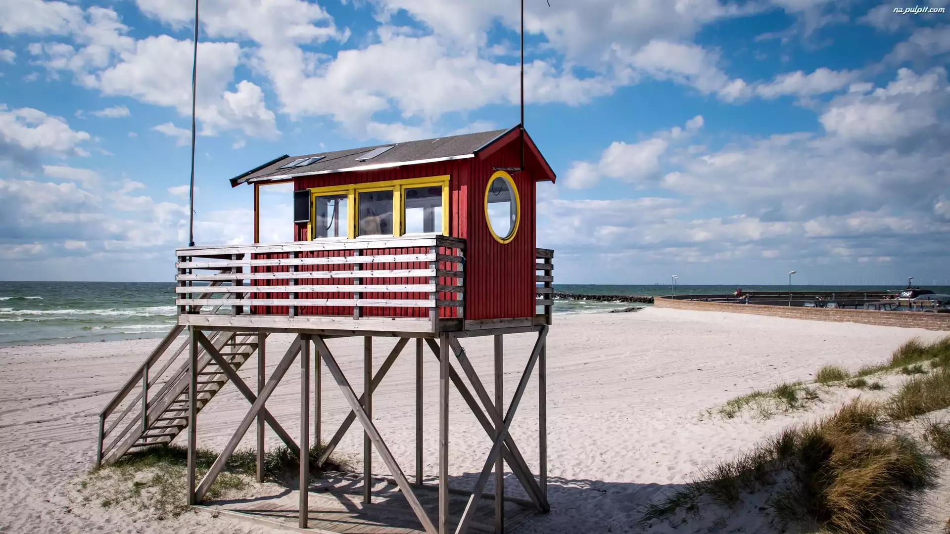 Piasek, Chmury, Plaża, Wieża ratownicza, Morze