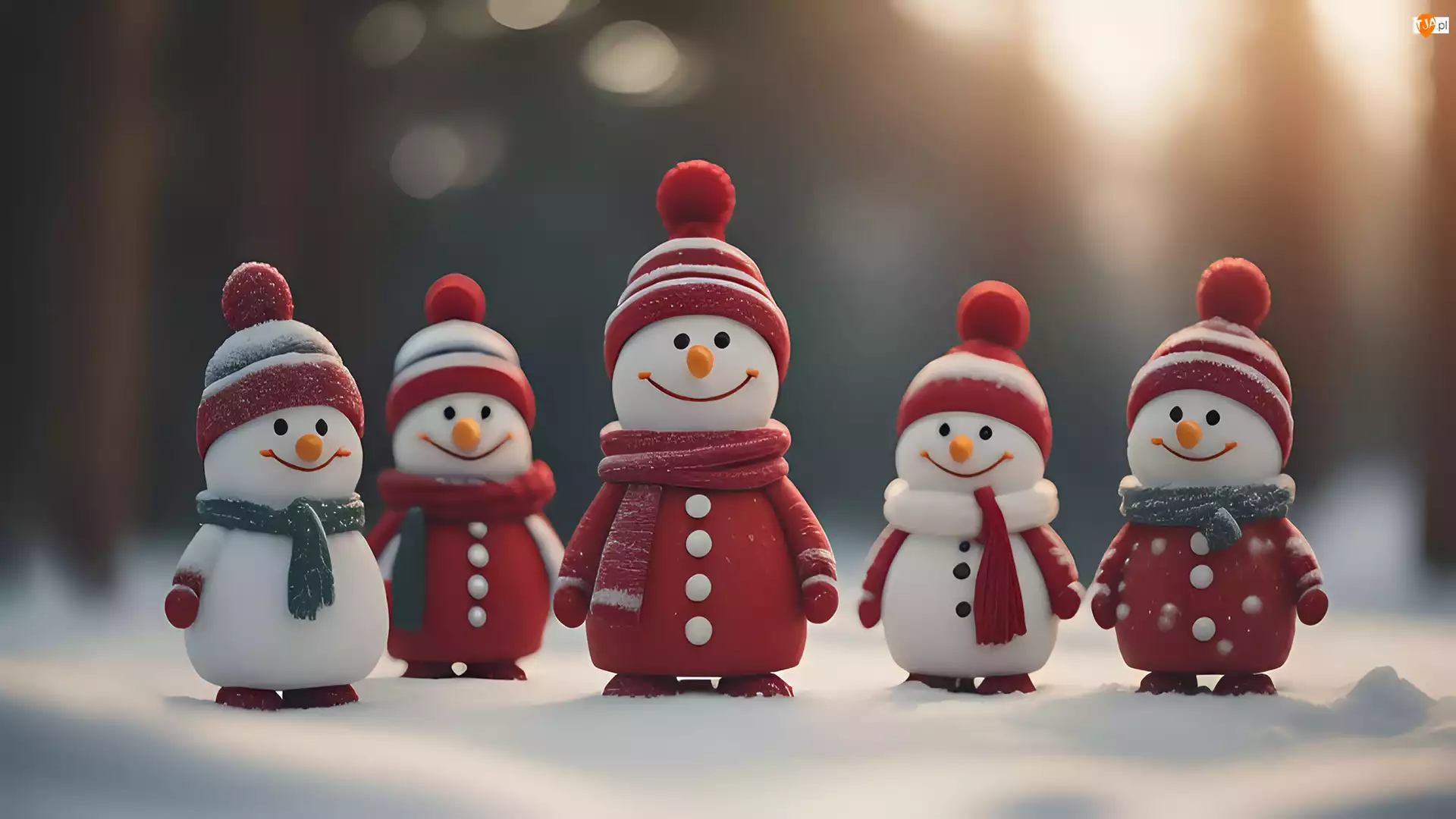 Pięć kolorowych bałwanków na śniegu