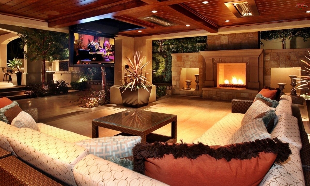 Telewizor, Piękny, Salon, Kominek