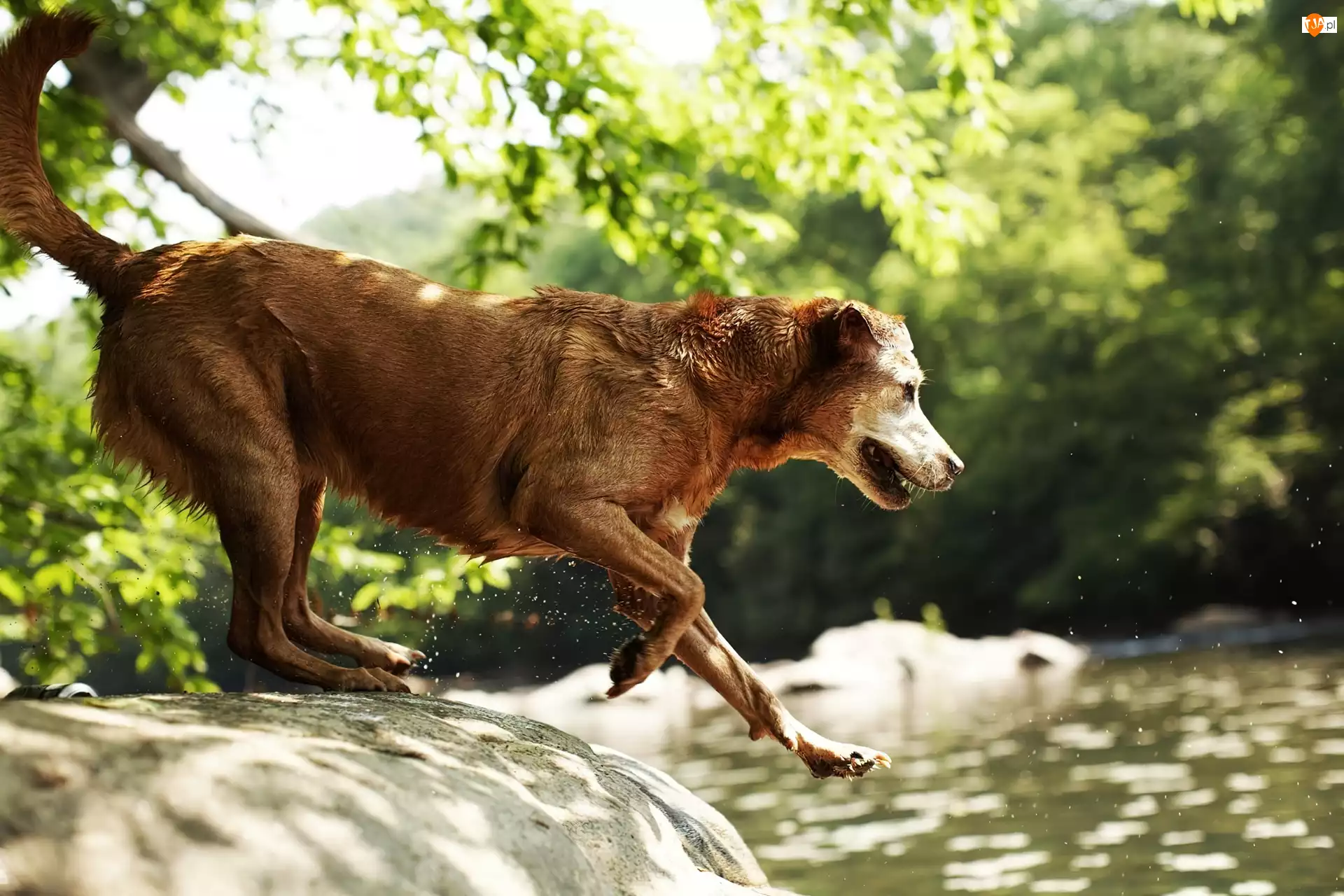 Pies, Drzewa, Woda, Skok