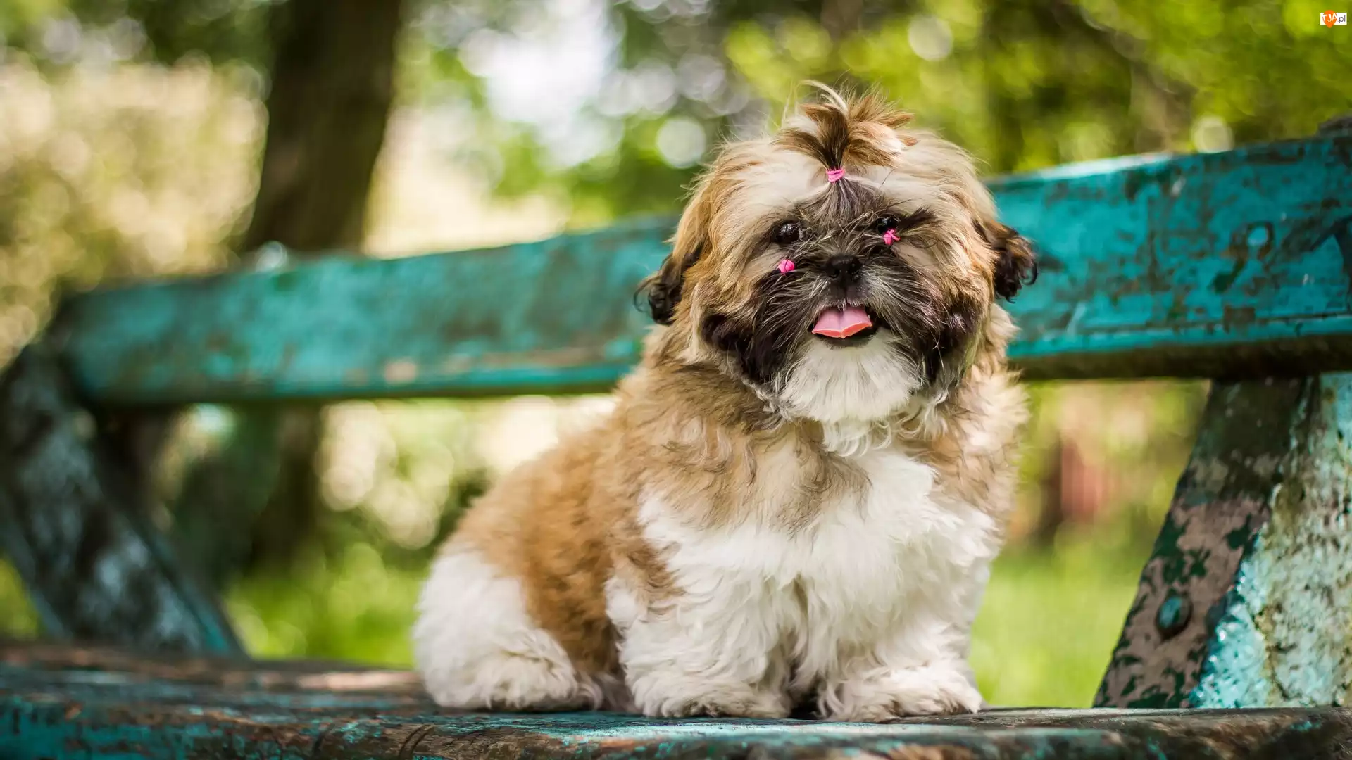 Shih tzu, Pies, Różowe, Ławka, Szczeniak, Gumki