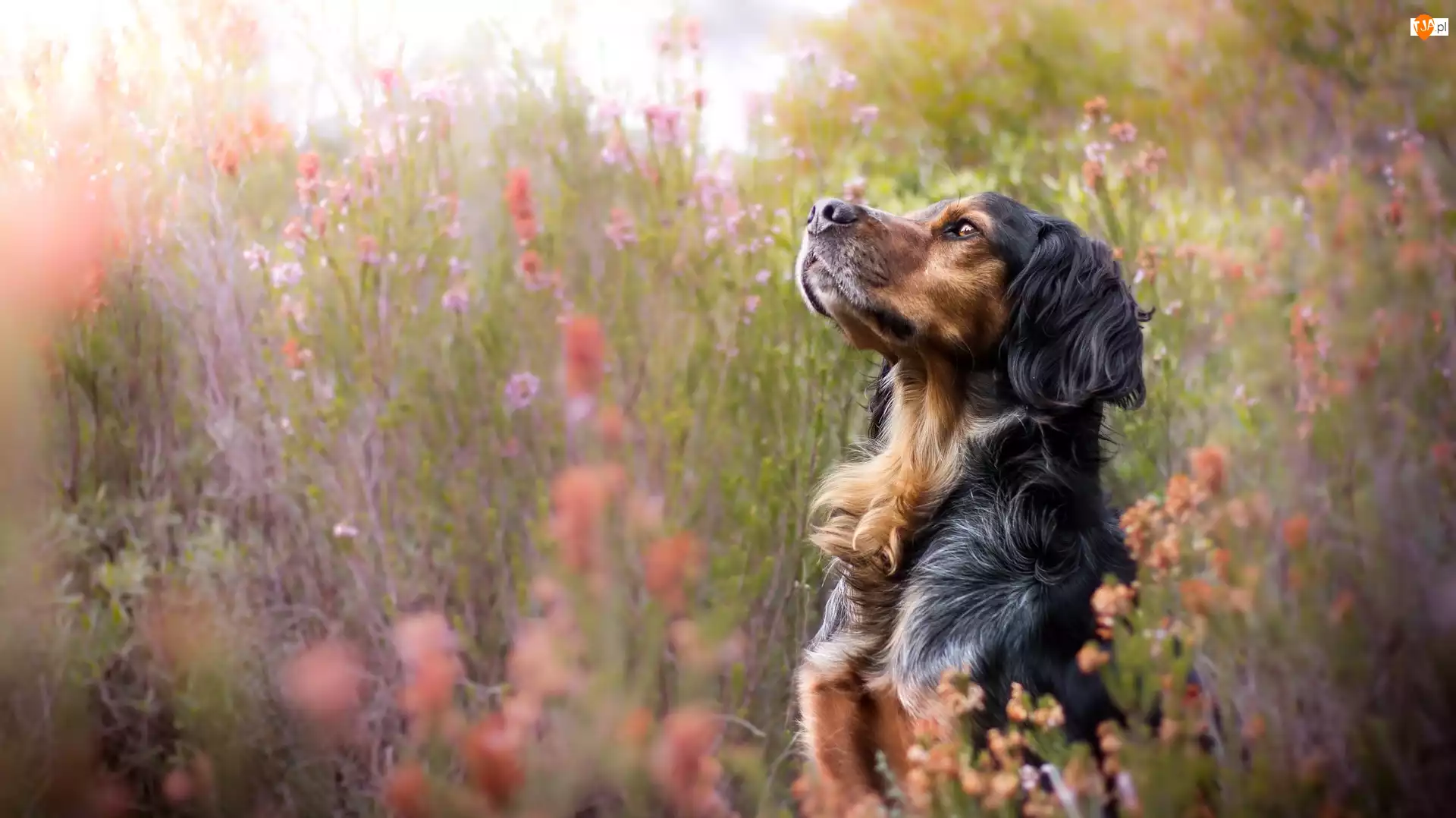 Pies wśród kwiatów na łące