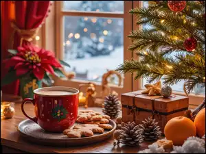 Kubek i ciasteczka na tacy obok szyszek i pomarańczy pod ma