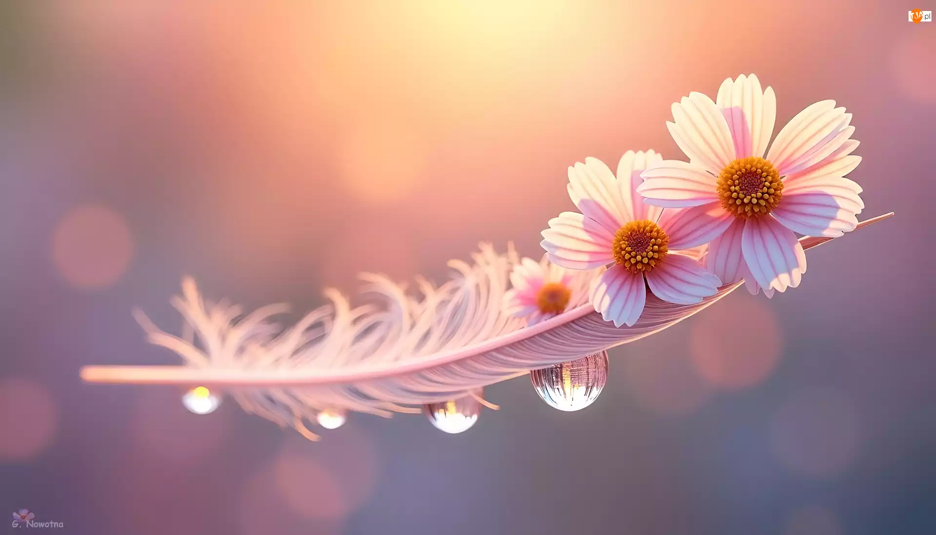 Piórko, Grafika AI, Kwiaty, Różowe, Krople