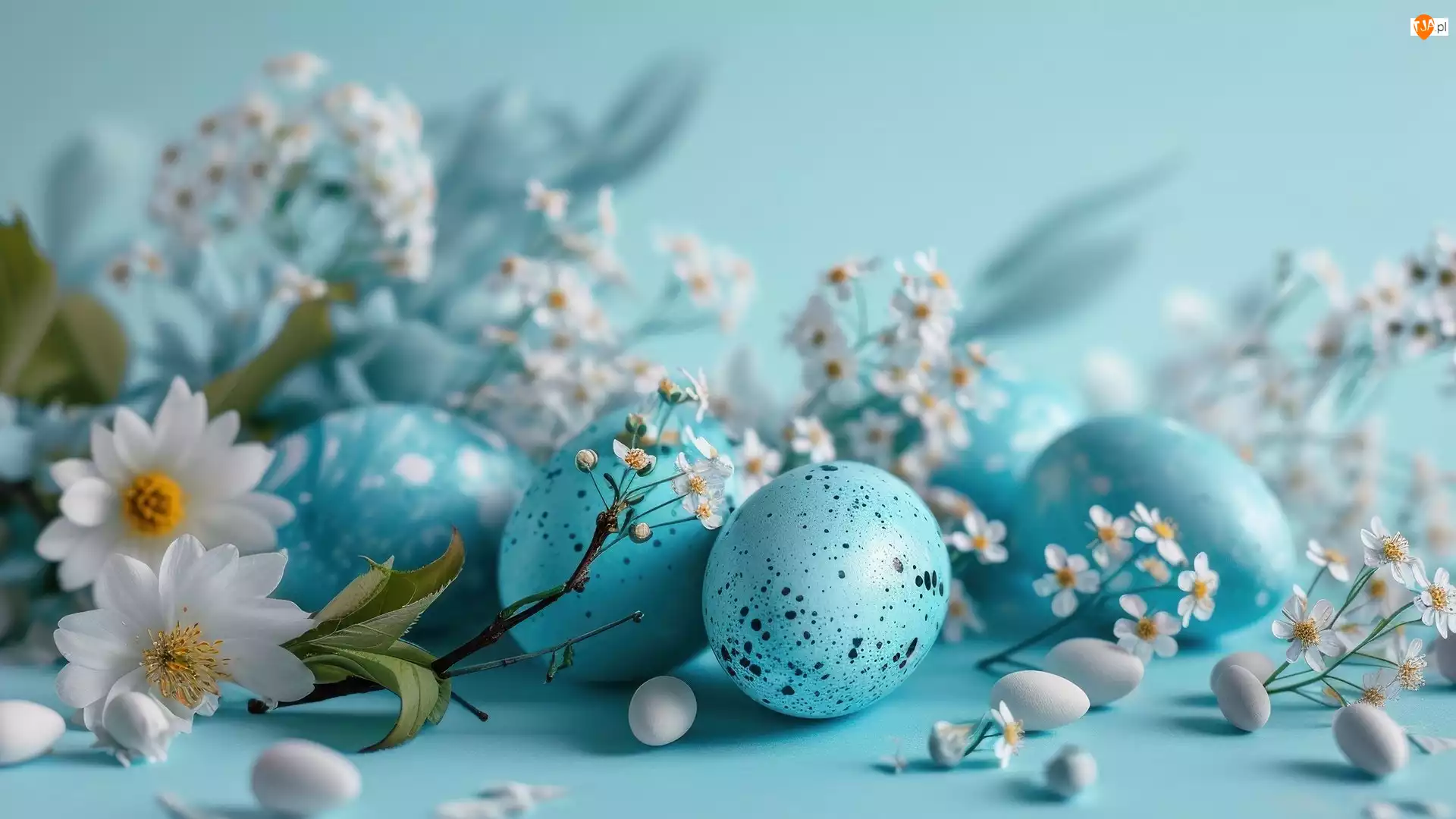 Pisanki, Kwiaty, Niebieskie, Wielkanoc, Białe