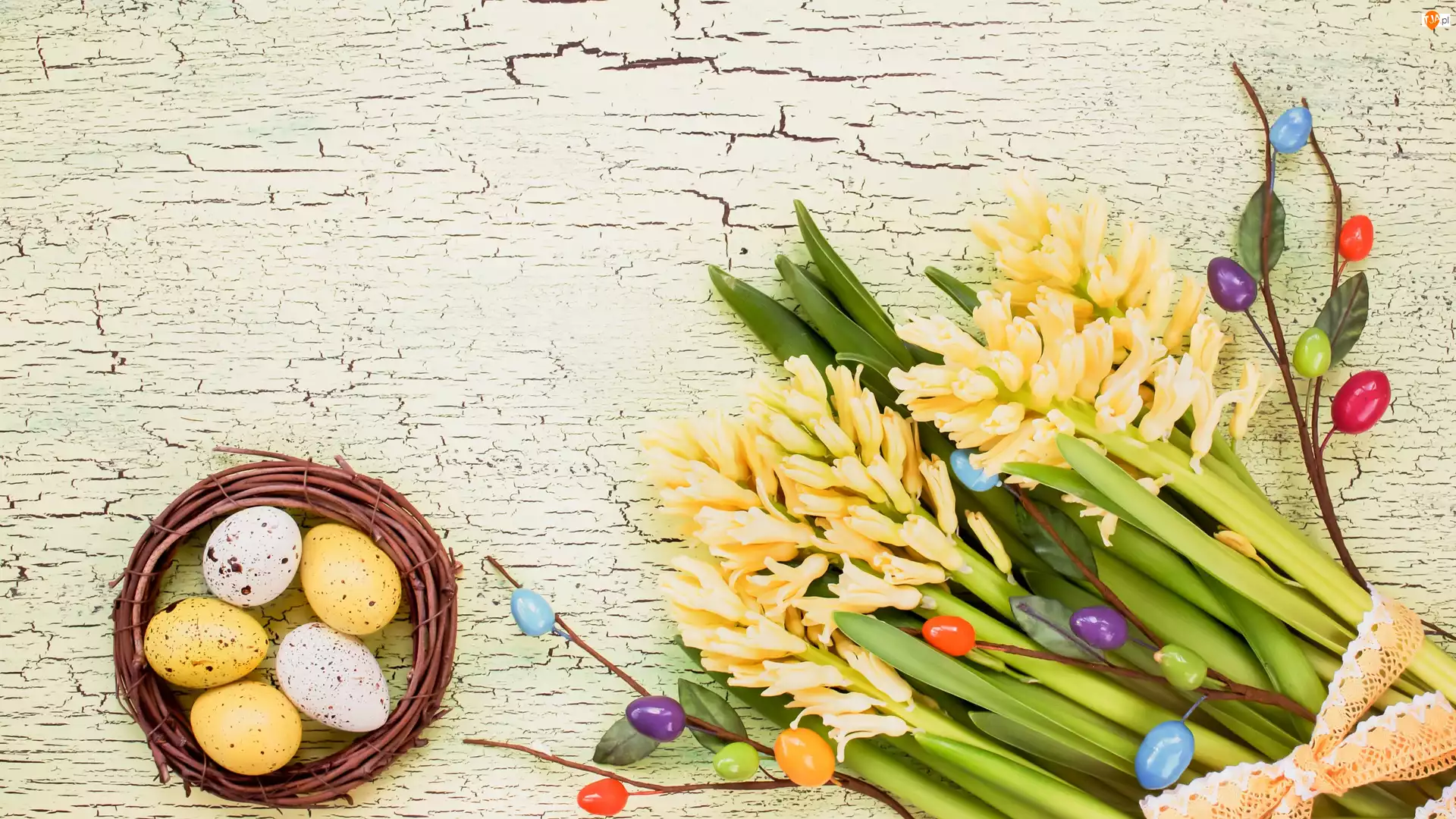 Żółte, Pisanki, Wielkanoc, Drewno, Hiacynty, Popękane