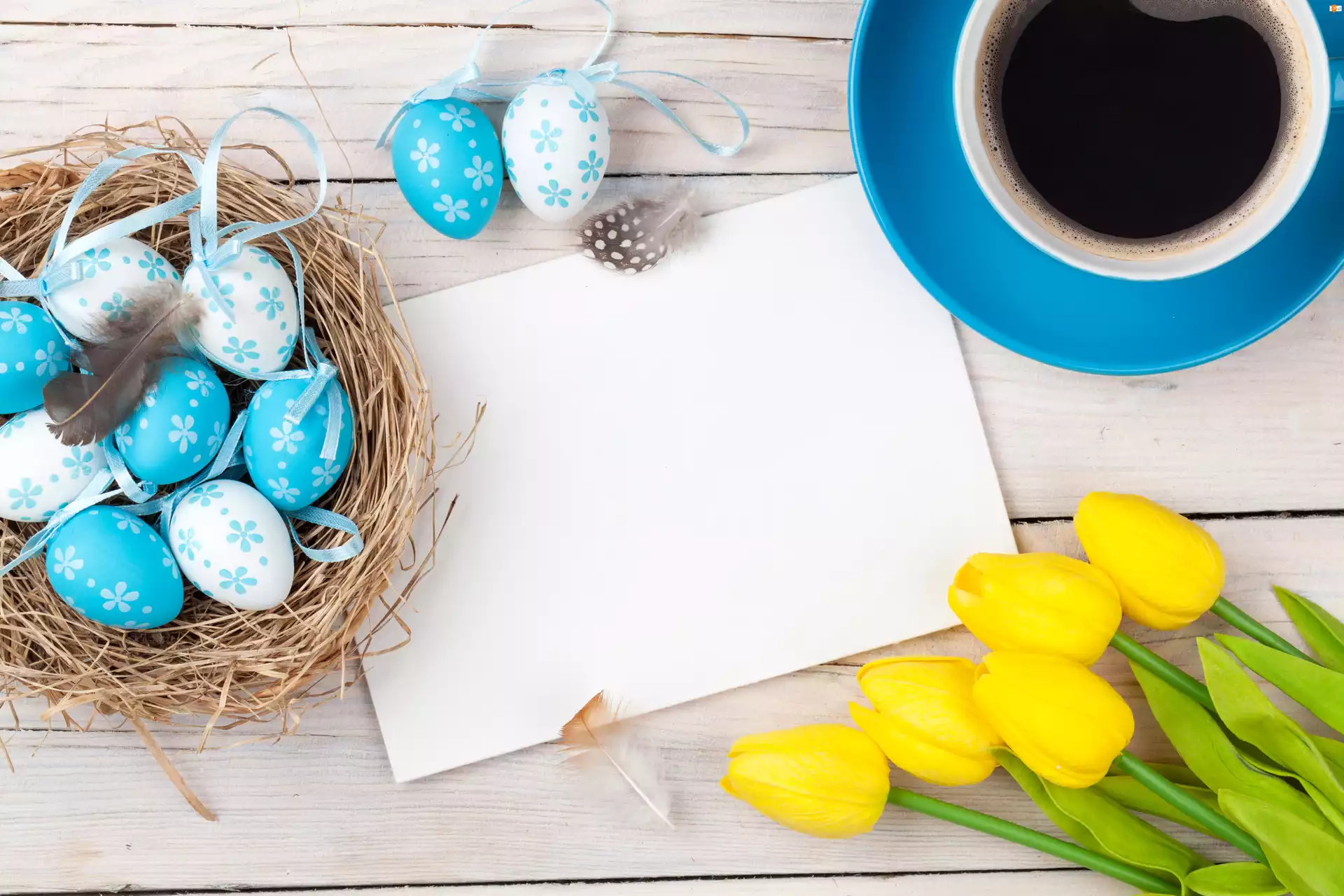 Tulipany, Pisanki, Wielkanoc, Kompozycja, Kawa, Gniazdo, Żółte