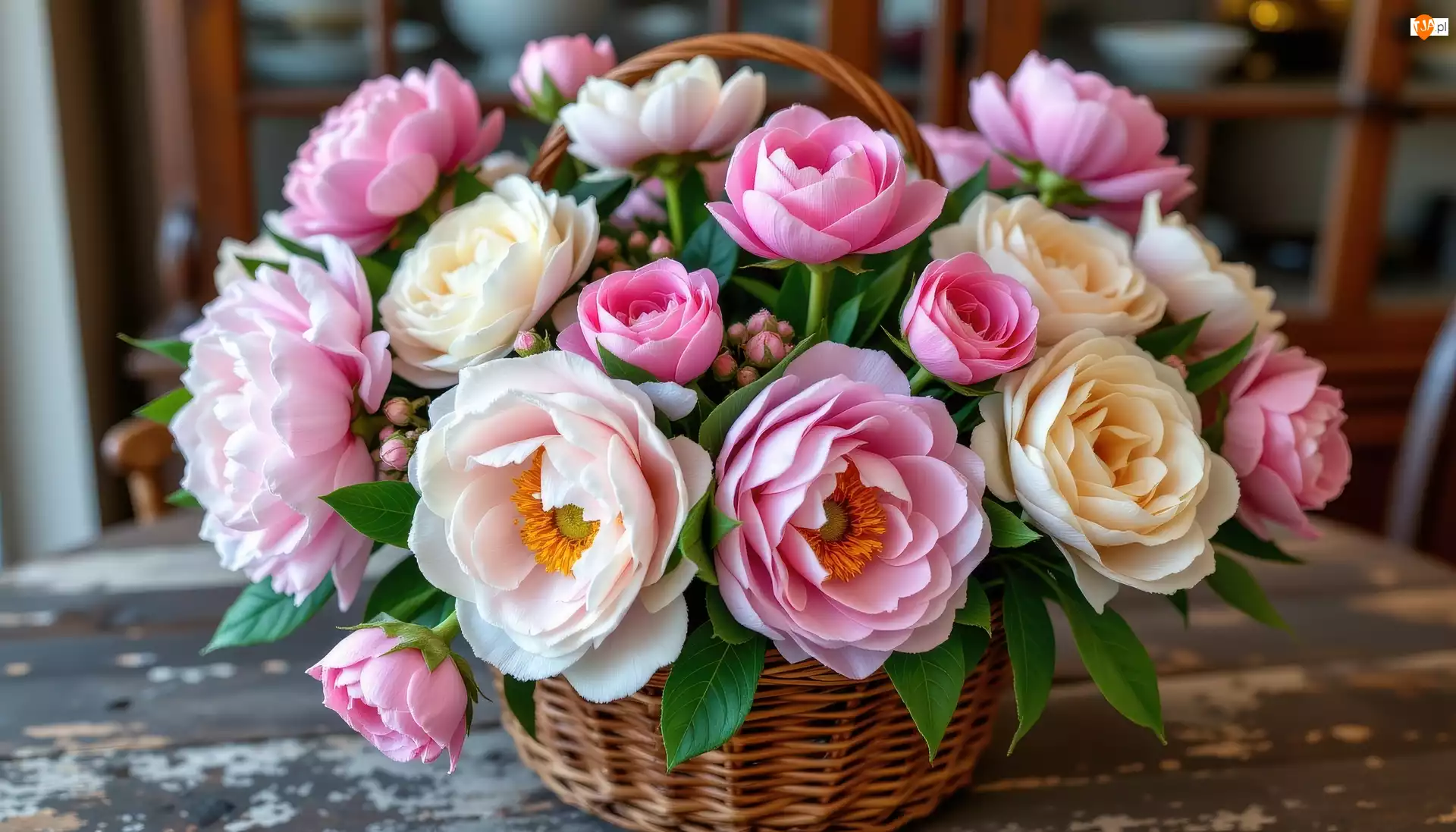 Piwonie, Kwiaty, Kremowe, Stół, Różowe, Koszyk