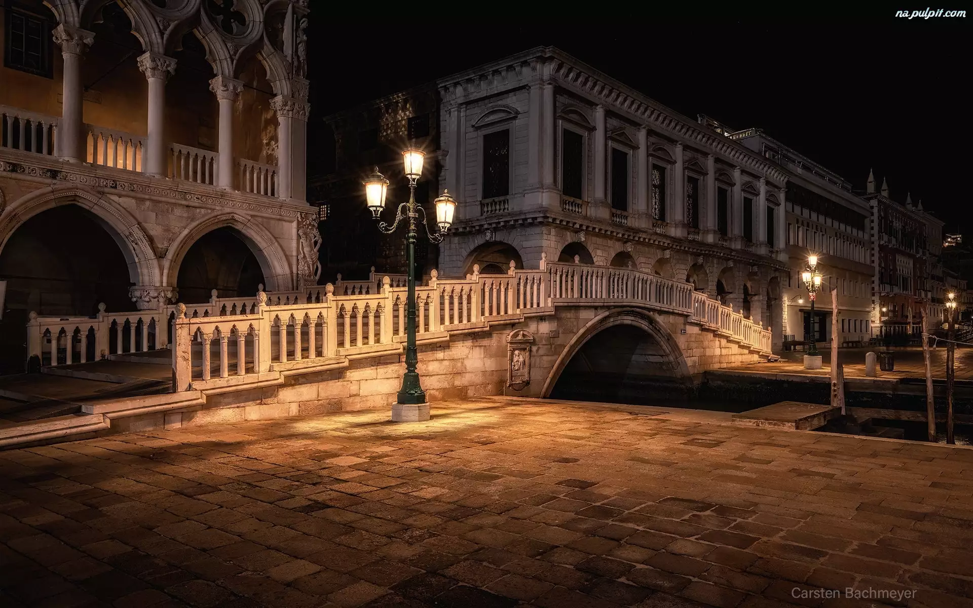 Wenecja, Włochy, Noc, Plac San Marco, Most, Latarnie