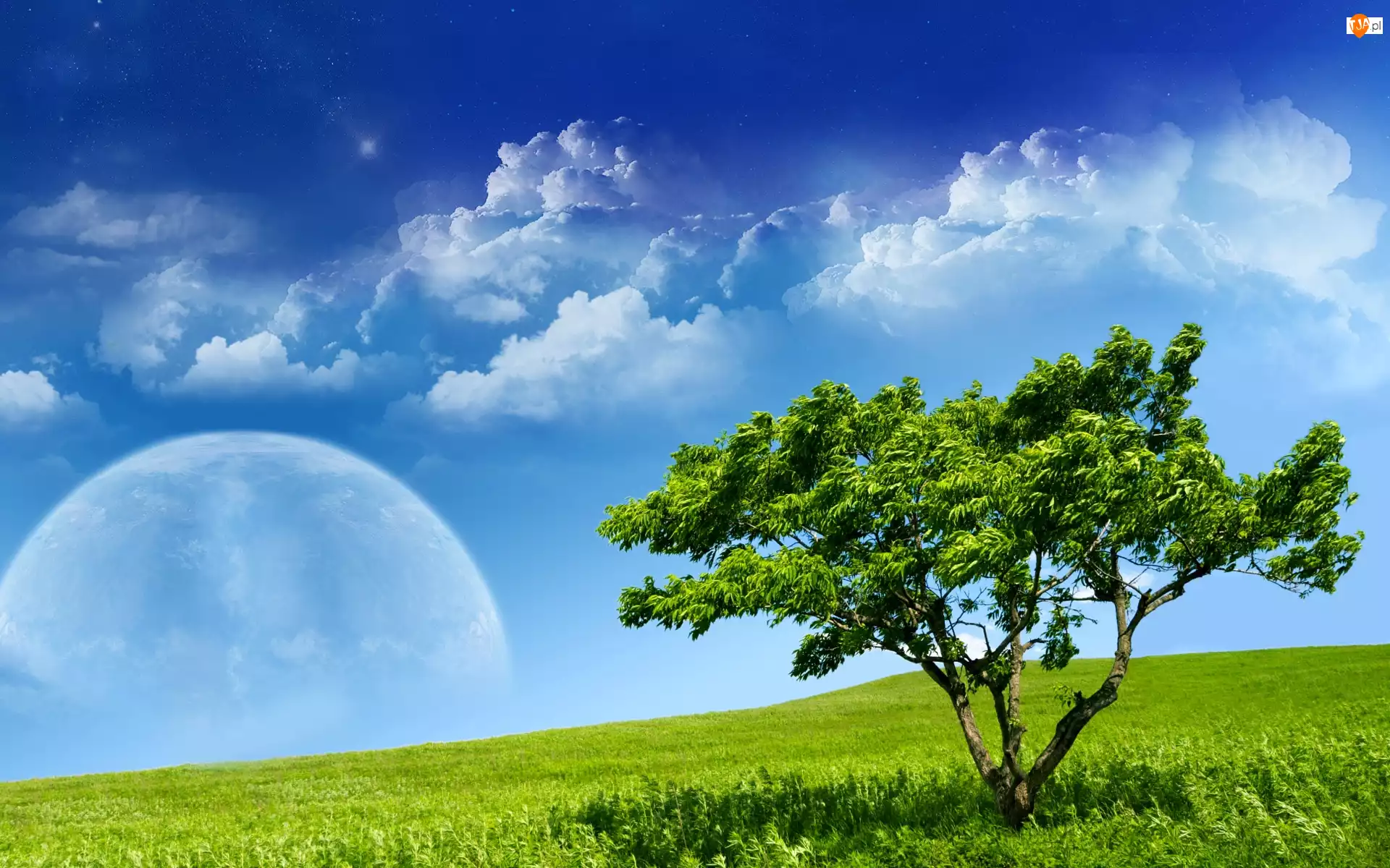 Planeta, Łąka, Drzewo, Chmury