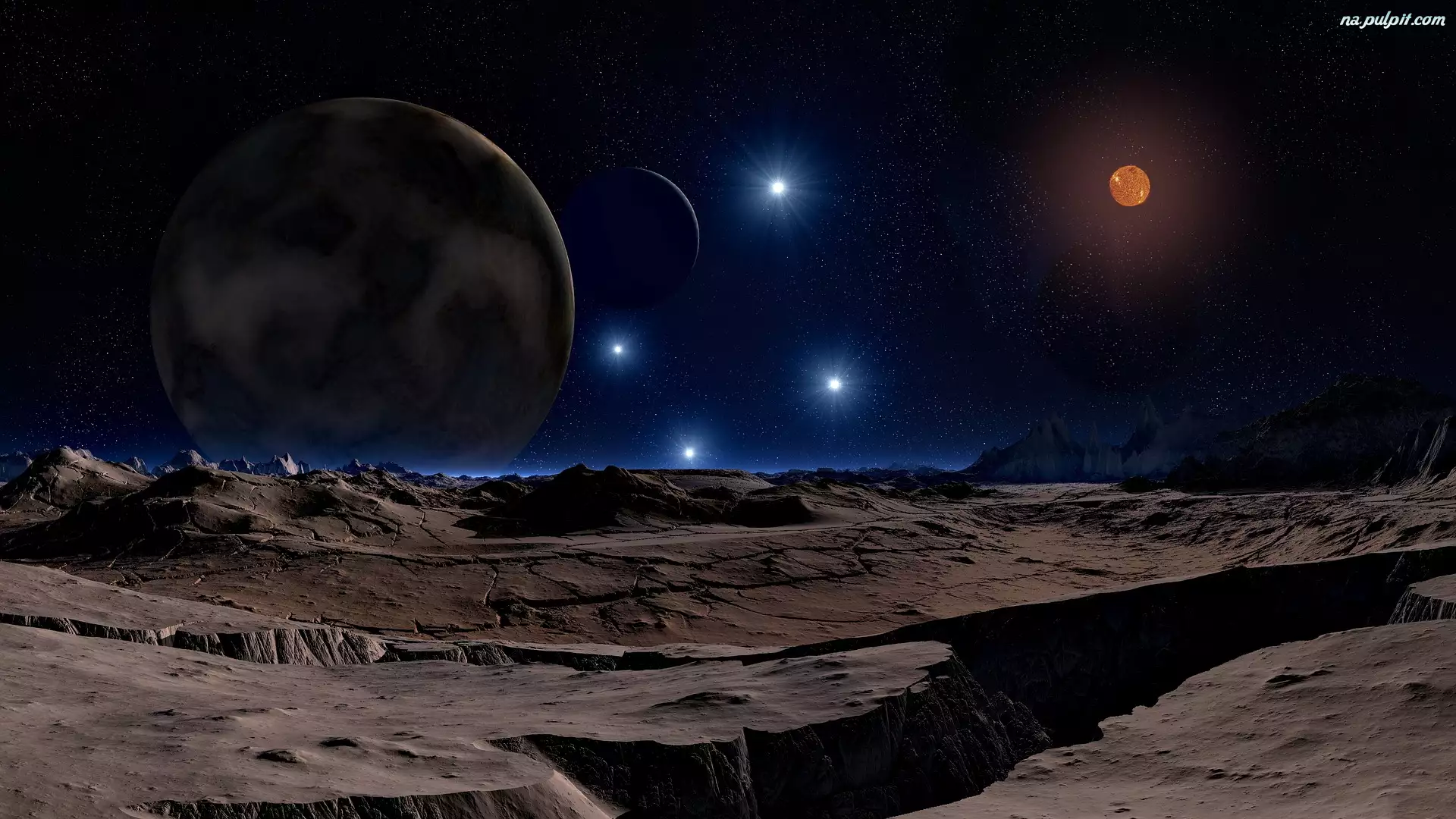 Krajobraz, Księżyc, 3D, Księżycowy, Gwiazdy, Planety, Kosmos