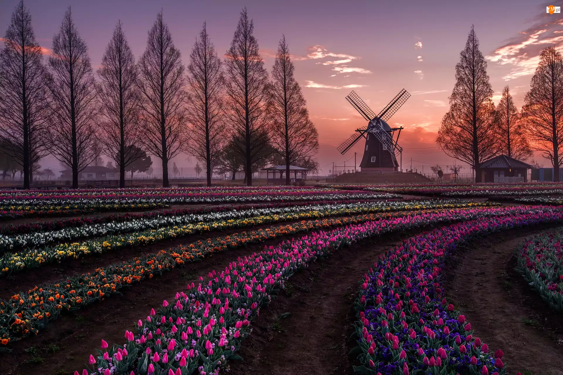 Tulipany, Wieczór, Plantacja, Wiosna, Wiatrak