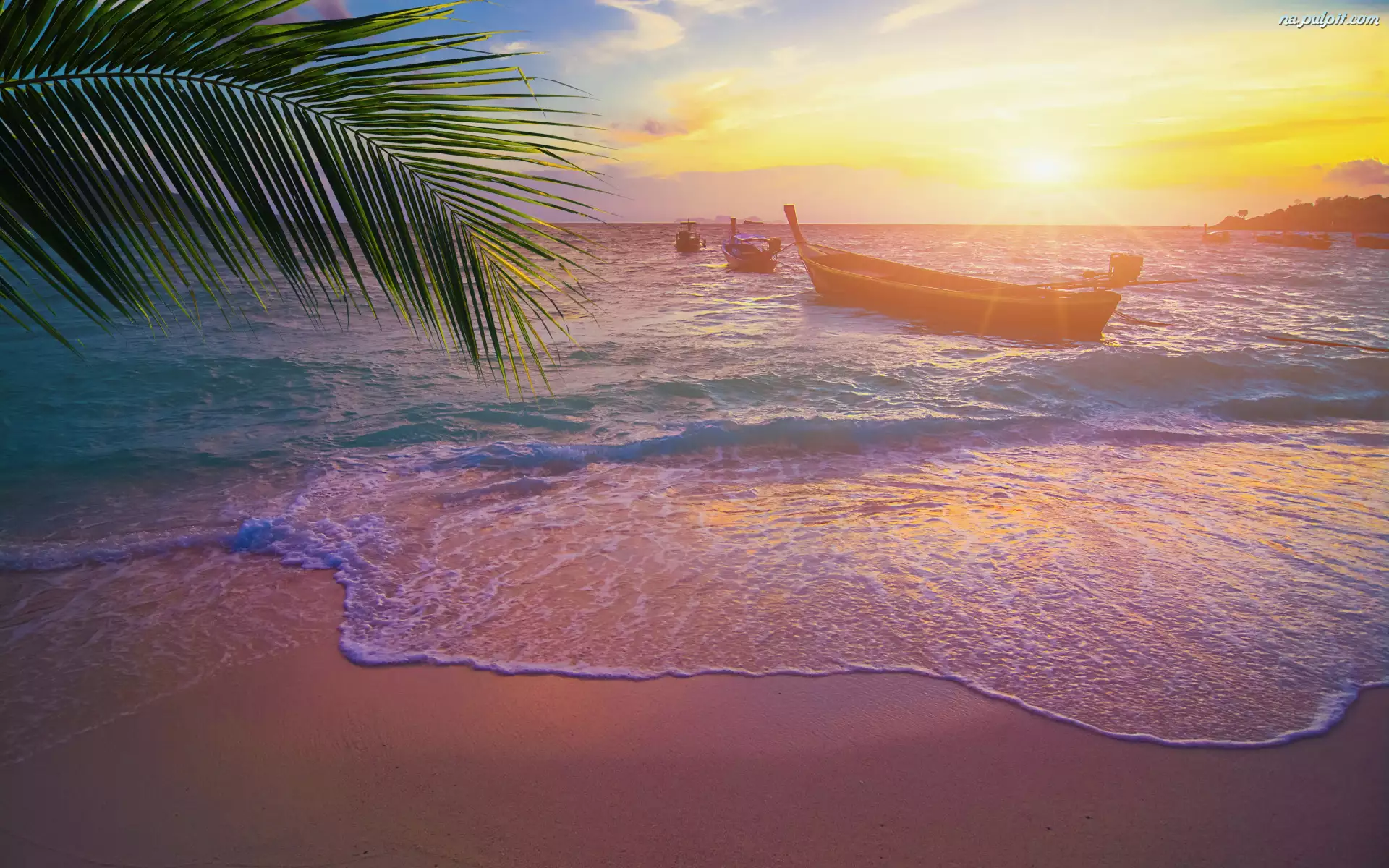 Plaża, Morze, Palma, Promienie słońca, Liść, Łódki