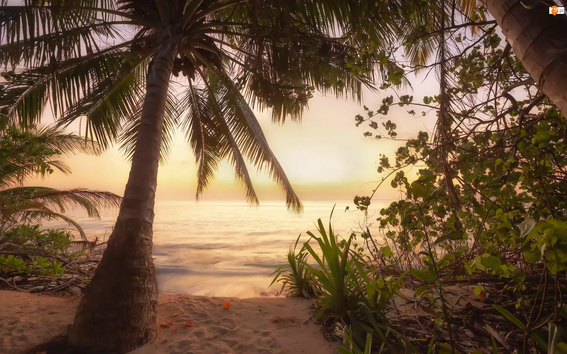 Morze, Palmy, Malediwy, Wschód słońca, Plaża